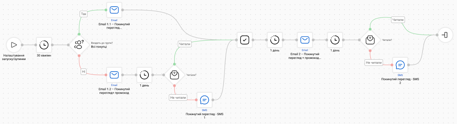 Ділюся прикладом сценарію «Покинутий перегляд», комунікація в якому відрізняється залежно від сегмента: перші покупці чи повторні.