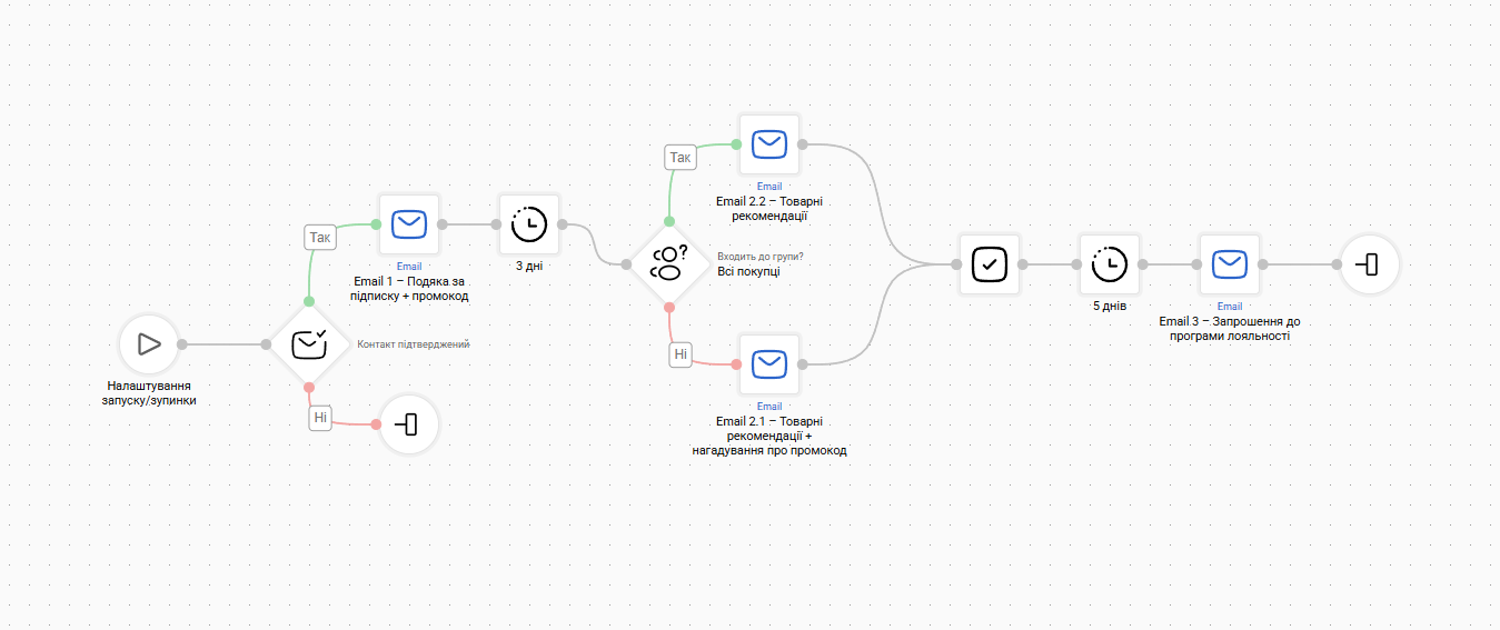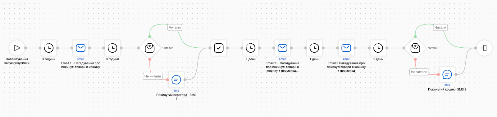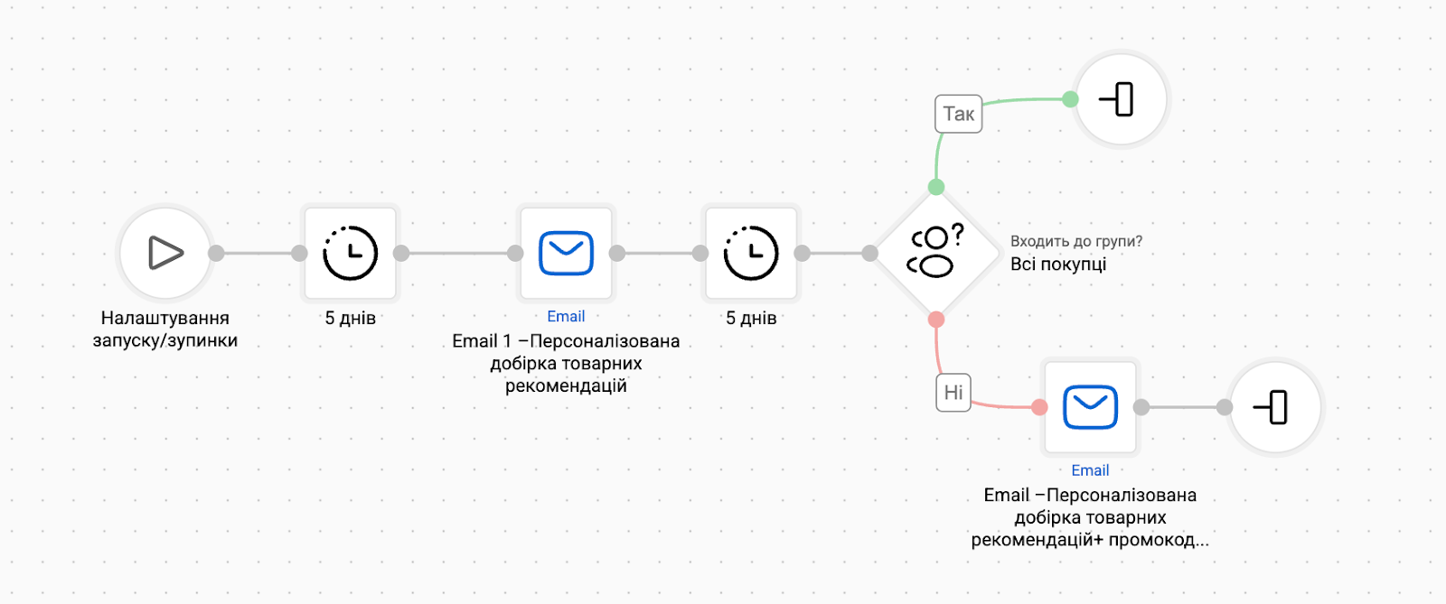 Кожен наступний лист відправляється за умови, що користувач не здійснив покупку з моменту старту флоу.