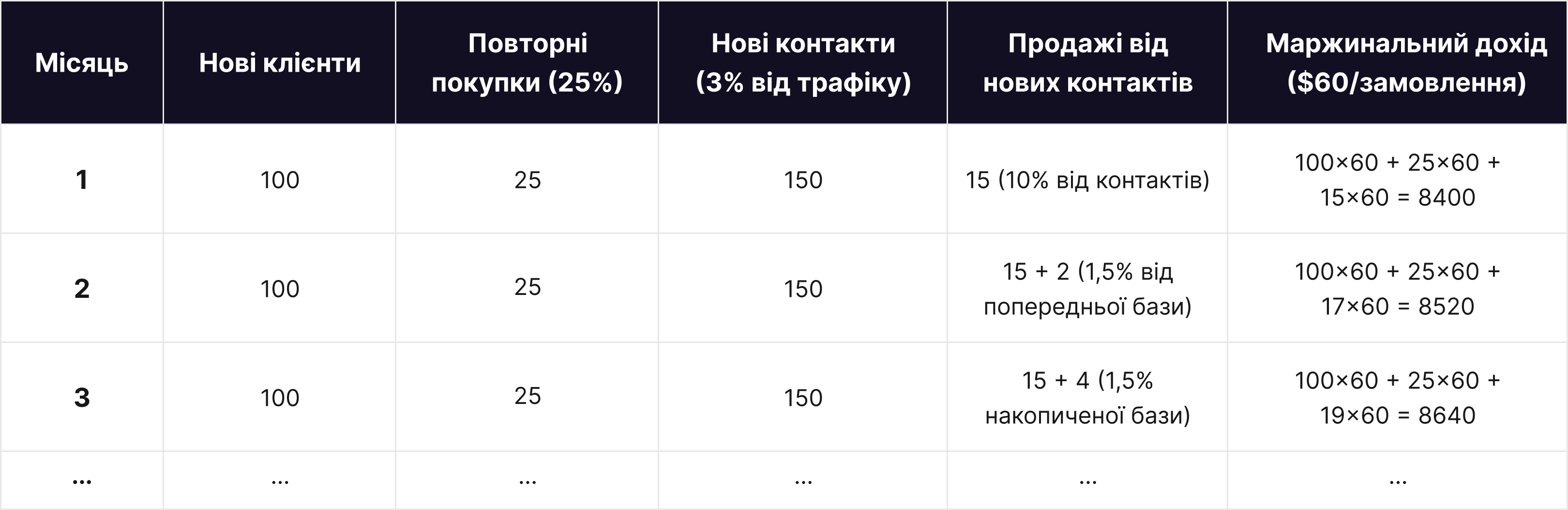 Сценарій без retention: 100 клієнтів × 6 місяців = 600 продажів → $36 000 маржинального доходу.