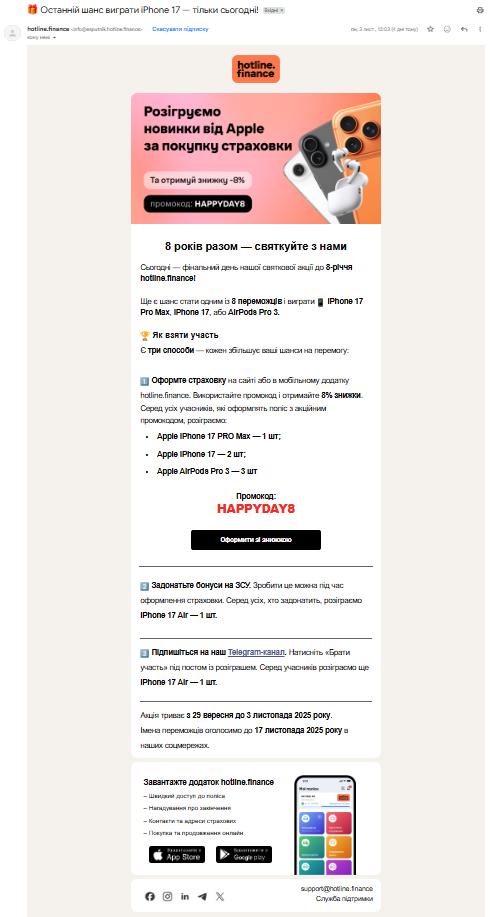 Додайте таймер або дату завершення пропозиції. За статистикою листи з таймерами збільшують CTR на 14%, а конверсію – на 9%.