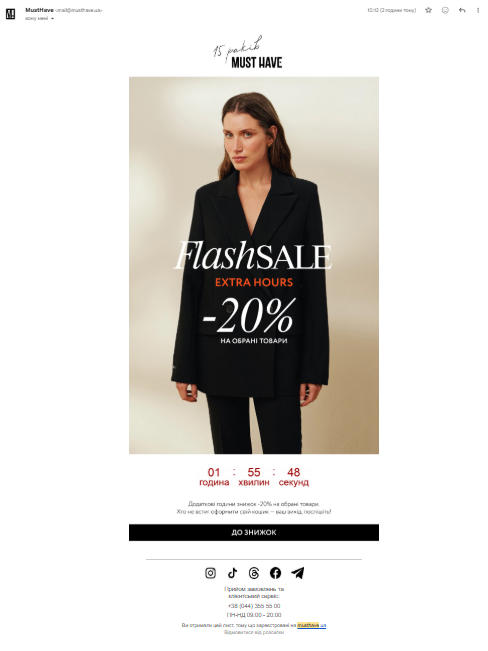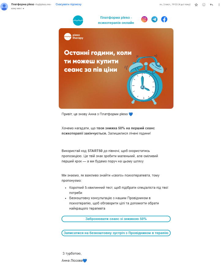 Лист 2 – «Тільки сьогодні» або «Знижка спеціально для вас» з таймером чи кодом.