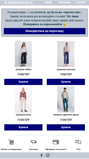 Кожен із листів має вести до чіткої CTA-кнопки (наприклад, «Переглянути пропозиції», «Повернутись до покупок», «Отримати -20%»).