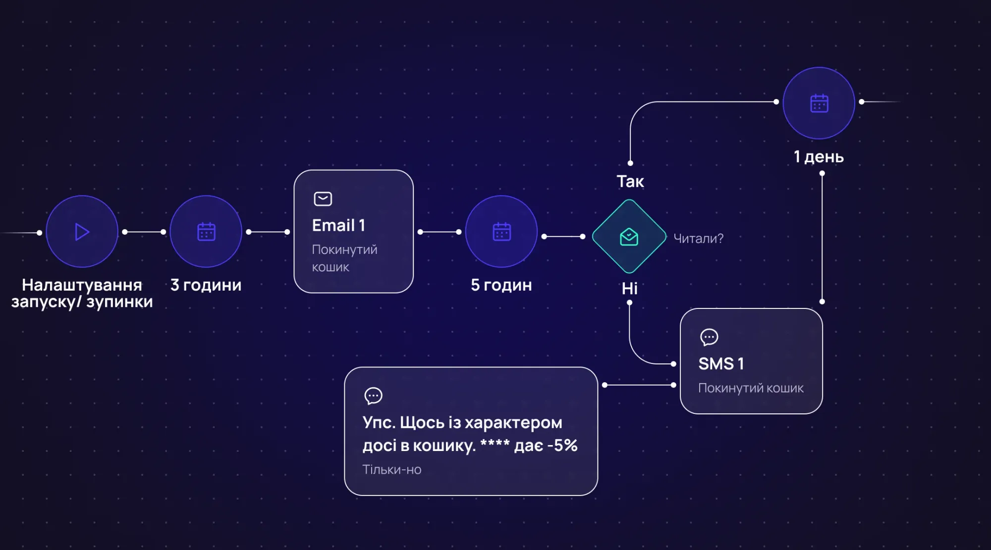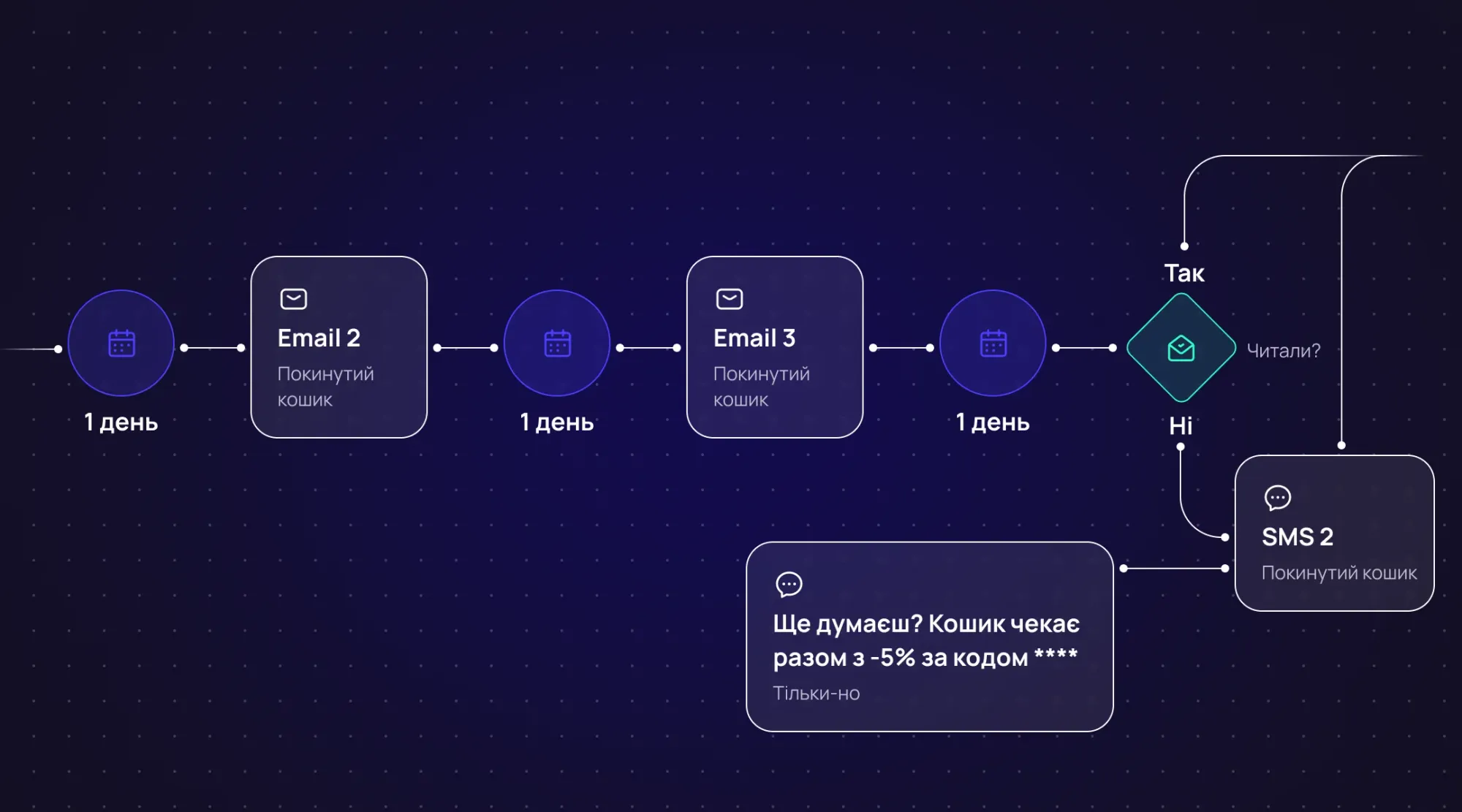 - SMS → скорочує шлях до дії → ловить момент високого наміру → повертає користувача тоді, коли email не спрацював