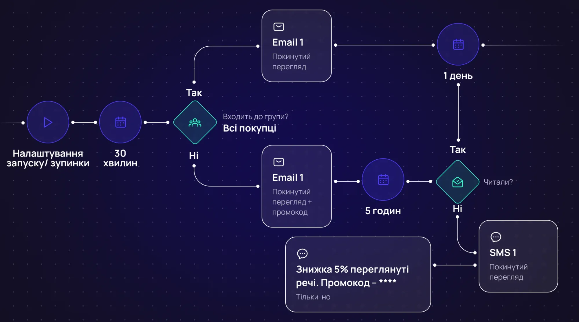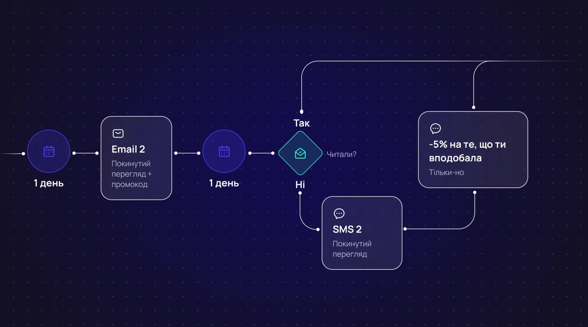 У цьому сценарії ми також бачимо, що смс відправляється лише після листів і тільки на тих, хто не читав лист. Повідомлення нагадувало про інтерес користувача та м’яко повертало його до каталогу або конкретного товару.