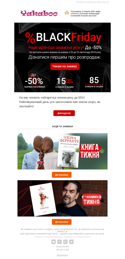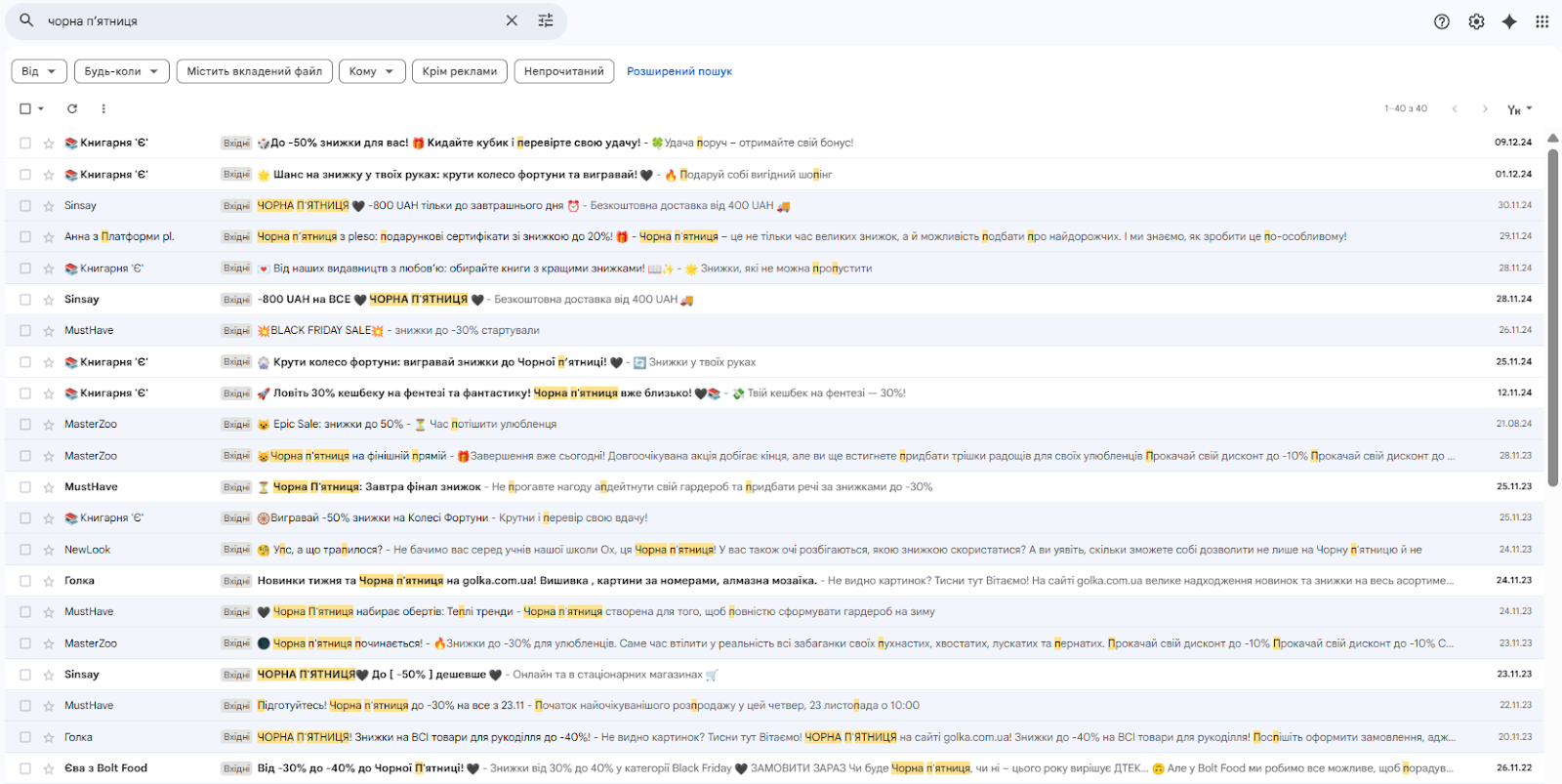 - Листи із загальним повідомленням про майбутні знижки (“Готуйтесь до Black Friday!”).