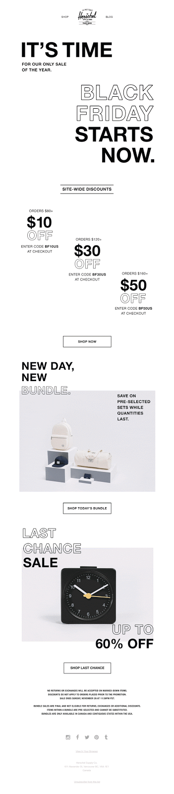 3. Основна пропозиція (Black Friday): лист із ключовими знижками та бестселерами. В листі інформуємо клієнтів про початок розпродажу, створіть відчуття терміновості.