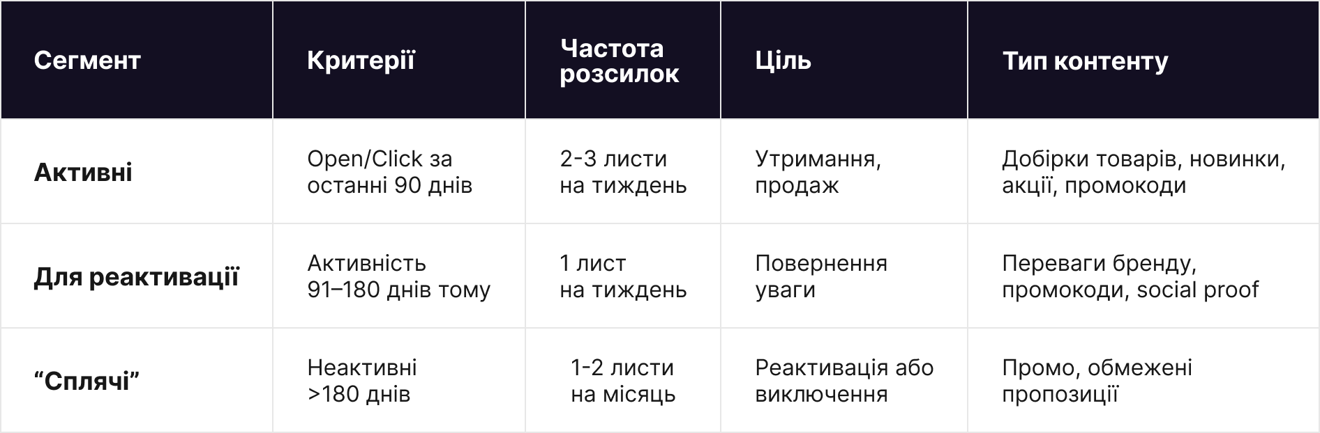 - Для активних контактів – 2-3 листи/тиждень: новинки, акції, персональні добірки.