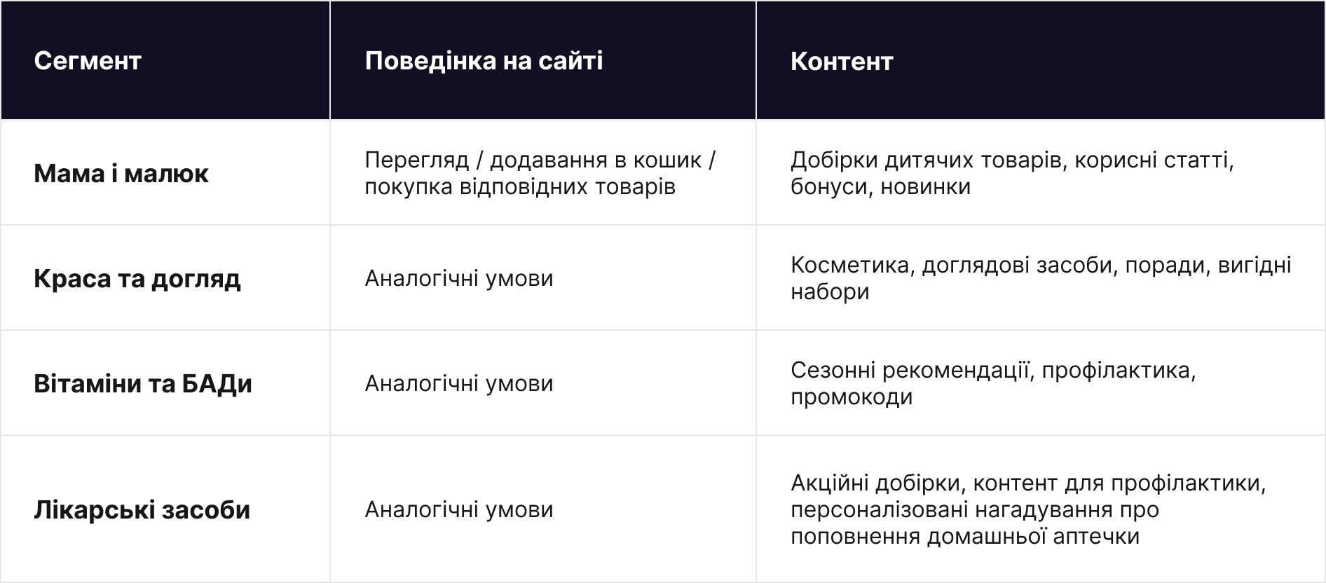 - Для поведінкових сегментів – контент із фокусом на інтереси.