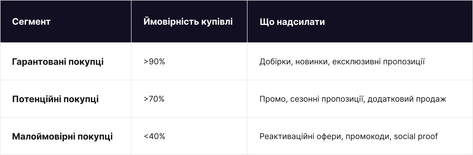Використовуйте Predictive-сегменти – вони працюють на основі поведінкової аналітики й прогнозують ймовірність покупки.