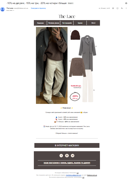 Запустіть серію кампаній постакційного періоду: замість знижок – фокус на сервісі, нових надходженнях, ідеях використання куплених товарів.